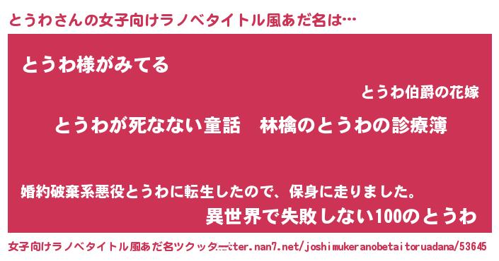 | ヘコむあだ名 | 『とうぷりん』『とうわ(遠い目)』 |