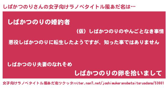| 男性向けラノベタイトル風あだ名 | 『この素晴らしい世界にしばかつのりを!』 |