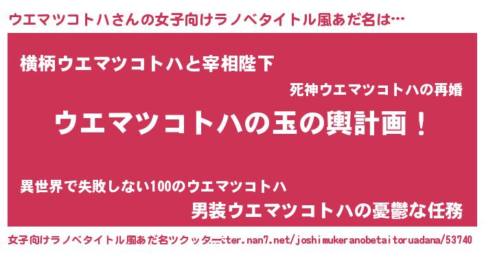 ウエマツコトハさんの女子向けラノベタイトル風あだ名は… 『ウエマツコトハの玉の輿計画!』『横柄ウエマツコトハと宰相陛下』『男装ウエマツコトハの憂鬱な任務』 ツクッター #女子向けラノベタイトル風あだ名ツクッター http://tkutter.nan7.net/joshimukeranobetaitoruadana/53740/