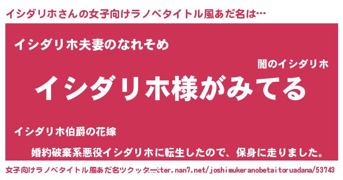 | 男性向けラノベタイトル風あだ名 | 『イシダリホの嫁は女の子じゃないと思った?』 |