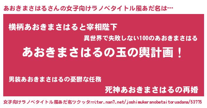 | 男性向けラノベタイトル風あだ名 | 『あおきまさはる~年齢イコール彼女いない歴の魔法使い~』 |