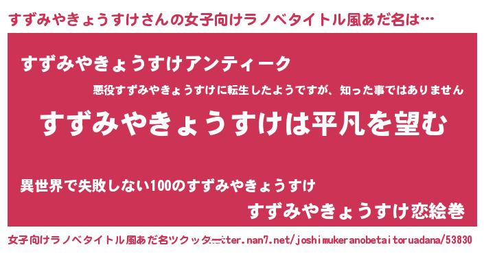 | 男性向けラノベタイトル風あだ名 | 『ダンジョンにすずみやきょうすけを求めるのは間違っているだろうか』 |