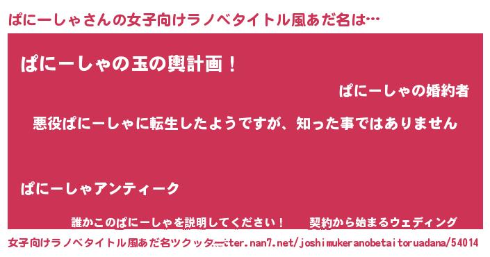 | 男性向けラノベタイトル風あだ名 | 『この素晴らしい世界にぱにーしゃを!』 |