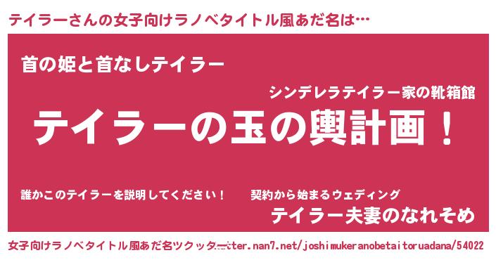 | 男性向けラノベタイトル風あだ名 | 『テイラー~年齢イコール彼女いない歴の魔法使い~』 |