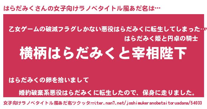 | 男性向けラノベタイトル風あだ名 | 『はらだみくに滅ぼされるだけの簡単なお仕事です』 |