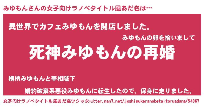 | 男性向けラノベタイトル風あだ名 | 『ノーゲーム・ノーミユモン』 |