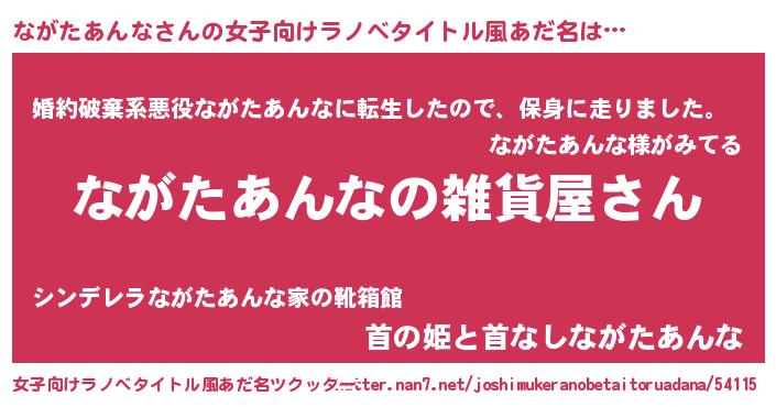 ながたあんなさんの女子向けラノベタイトル風あだ名は… 『ながたあんなの雑貨屋さん』『婚約破棄系悪役ながたあんなに転生したので、保身に走りました。』『首の姫と首なしながたあんな』 ツクッター #女子向けラノベタイトル風あだ名ツクッター http://tkutter.nan7.net/joshimukeranobetaitoruadana/54115/
