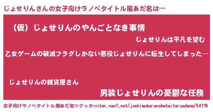 | 男性向けラノベタイトル風あだ名 | 『この素晴らしい世界にじょせりんを!』 |