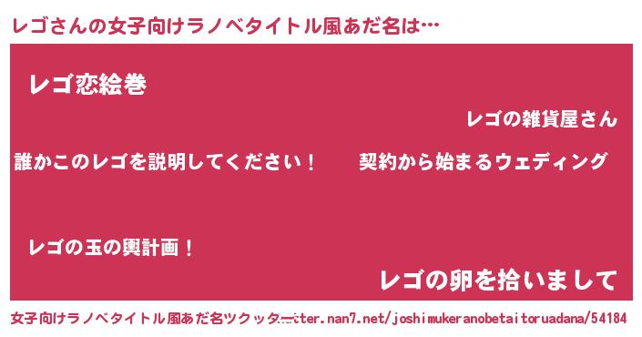 レゴさんの女子向けラノベタイトル風あだ名は… 『誰かこのレゴを説明してください! ~契約から始まるウェディング~』『レゴ恋絵巻』『レゴの卵を拾いまして』 ツクッター #女子向けラノベタイトル風あだ名ツクッター http://tkutter.nan7.net/joshimukeranobetaitoruadana/54184/