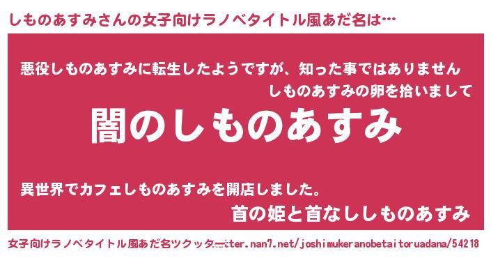 | 男性向けラノベタイトル風あだ名 | 『Re:しものあすみから始める異世界生活』 |