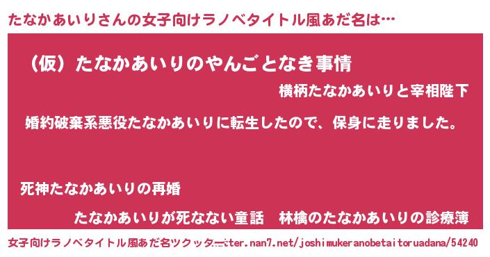 | 男性向けラノベタイトル風あだ名 | 『転生したらたなかあいりだった件』 |