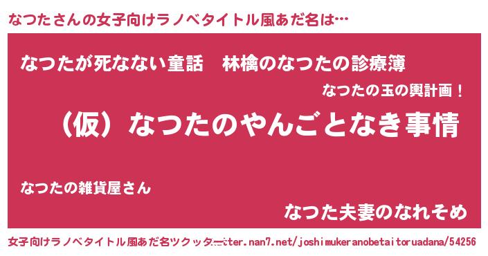 | 男性向けラノベタイトル風あだ名 | 『なつたの憂鬱』『魔弾の王となつた』 |