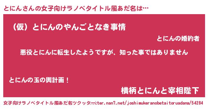 | 男性向けラノベタイトル風あだ名 | 『この素晴らしい世界にとにんを!』 |