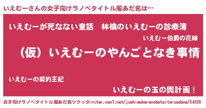 | 男性向けラノベタイトル風あだ名 | 『いえむーの憂鬱』『魔弾の王といえむー』 |