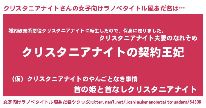 | 男性向けラノベタイトル風あだ名 | 『誰もが恐れるあのクリスタニアナイトが、ぼくの専属メイドになるようです。』 |