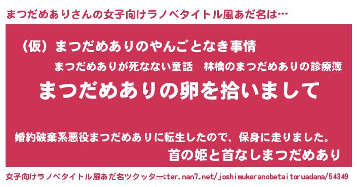 | 男性向けラノベタイトル風あだ名 | 『まつだめありの嫁は女の子じゃないと思った?』 |