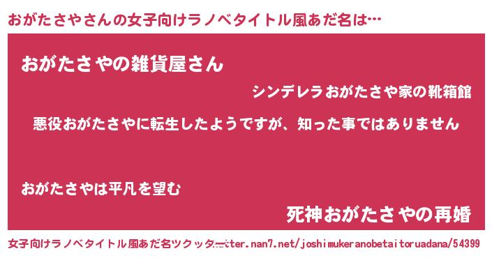 | 男性向けラノベタイトル風あだ名 | 『この素晴らしい世界におがたさやを!』 |