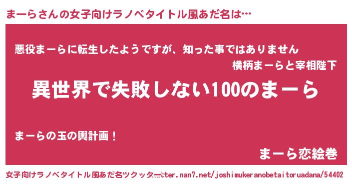 | 男性向けラノベタイトル風あだ名 | 『まーらという概念が存在しない退屈な世界 』 |