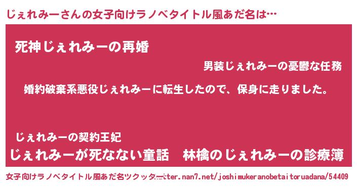 じぇれみーさんの女子向けラノベタイトル風あだ名は… 『婚約破棄系悪役じぇれみーに転生したので、保身に走りました。』『死神じぇれみーの再婚』『じぇれみーが死なない童話 林檎のじぇれみーの診療簿』 ツクッター #女子向けラノベタイトル風あだ名ツクッター http://tkutter.nan7.net/joshimukeranobetaitoruadana/54409/
