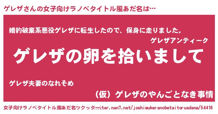 | 男性向けラノベタイトル風あだ名 | 『ゲレザの嫁は女の子じゃないと思った?』 |