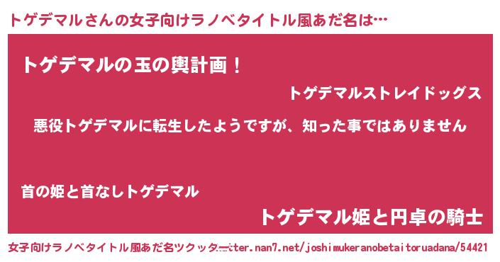 | 男性向けラノベタイトル風あだ名 | 『この素晴らしい世界にトゲデマルを!』 |