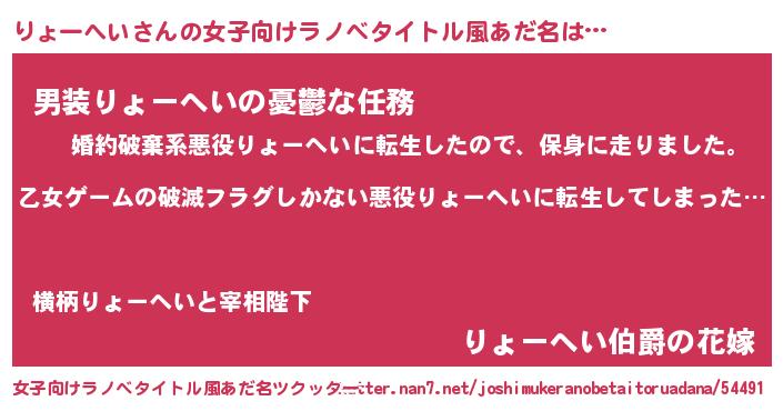 | 男性向けラノベタイトル風あだ名 | 『魔弾の王とりょーへい』 |