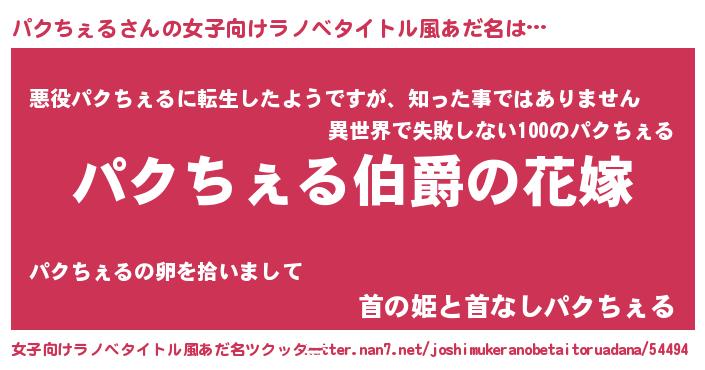 | 男性向けラノベタイトル風あだ名 | 『うちの娘の為ならば、俺はもしかしたらパクちぇるも倒せるかもしれない。』 |
