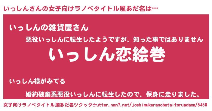 いっしんさんの女子向けラノベタイトル風あだ名は… 『いっしん恋絵巻』『いっしんの雑貨屋さん』『婚約破棄系悪役いっしんに転生したので、保身に走りました。』 ツクッター #女子向けラノベタイトル風あだ名ツクッター http://tkutter.nan7.net/joshimukeranobetaitoruadana/5458/