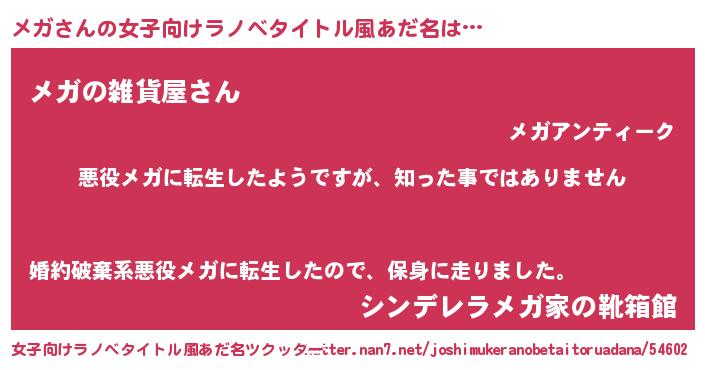 | 男性向けラノベタイトル風あだ名 | 『この素晴らしい世界にメガを!』 |