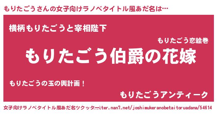 | 男性向けラノベタイトル風あだ名 | 『うちの娘の為ならば、俺はもしかしたらもりたごうも倒せるかもしれない。』 |