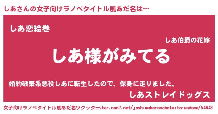 | 男性向けラノベタイトル風あだ名 | 『しあの嫁は女の子じゃないと思った?』 |