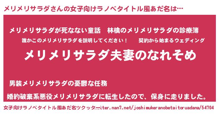 | 男性向けラノベタイトル風あだ名 | 『おまえをオタクにしてやるから、俺をメリメリサラダにしてくれ! 』 |
