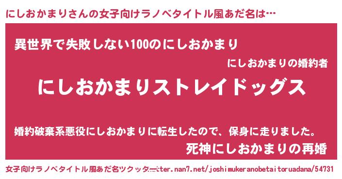 | 男性向けラノベタイトル風あだ名 | 『Re:にしおかまりから始める異世界生活』 |