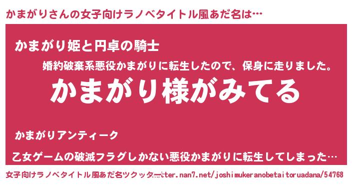 | 男性向けラノベタイトル風あだ名 | 『かまがりの嫁は女の子じゃないと思った?』 |