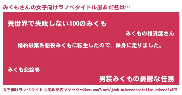 | 男性向けラノベタイトル風あだ名 | 『ミクモスレイヤー』 |