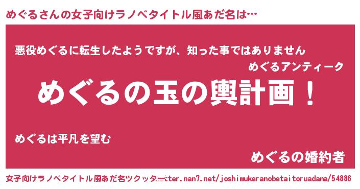 | 男性向けラノベタイトル風あだ名 | 『転生したらめぐるだった件』 |