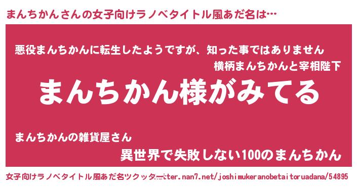 | 男性向けラノベタイトル風あだ名 | 『まんちかんの嫁は女の子じゃないと思った?』 |