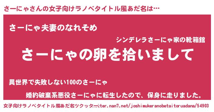 | 男性向けラノベタイトル風あだ名 | 『さーにゃの嫁は女の子じゃないと思った?』 |