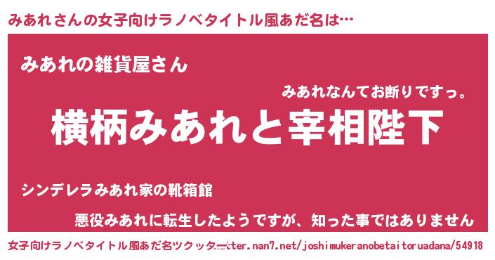 | 男性向けラノベタイトル風あだ名 | 『みあれに滅ぼされるだけの簡単なお仕事です』 |