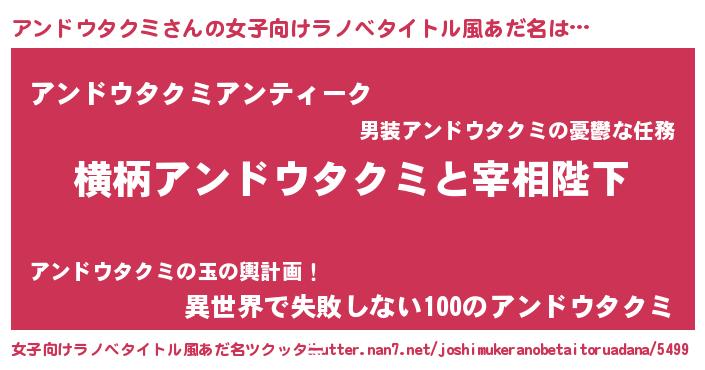 | 男性向けラノベタイトル風あだ名 | 『アンドウタクミに滅ぼされるだけの簡単なお仕事です』 |