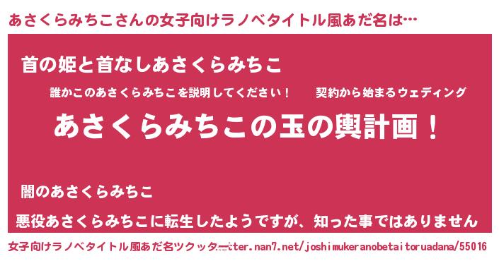 あさくらみちこさんの女子向けラノベタイトル風あだ名は… 『あさくらみちこの玉の輿計画!』『首の姫と首なしあさくらみちこ』『悪役あさくらみちこに転生したようですが、知った事ではありません』 ツクッター #女子向けラノベタイトル風あだ名ツクッター http://tkutter.nan7.net/joshimukeranobetaitoruadana/55016/