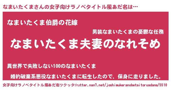 | 男性向けラノベタイトル風あだ名 | 『おまえをオタクにしてやるから、俺をなまいたくまにしてくれ! 』 |