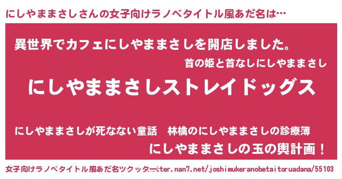 | 男性向けラノベタイトル風あだ名 | 『Re:にしやままさしから始める異世界生活』 |