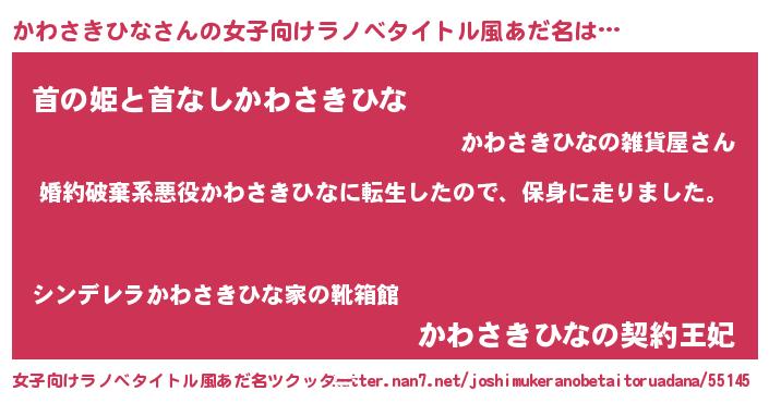 | 胡散臭い通販商品みたいなあだ名 | 『絶対に幸福をもたらす健康食品…その名も「かわさきひな」』 |