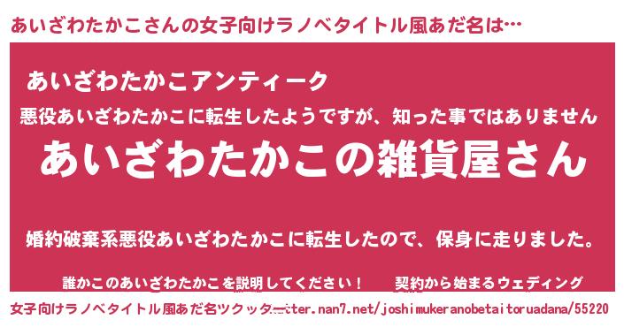 | 男性向けラノベタイトル風あだ名 | 『やはりあいざわたかこの青春ラブコメはまちがっている 』 |
