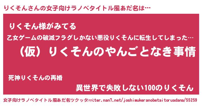 | 男性向けラノベタイトル風あだ名 | 『りくそんの憂鬱』『魔弾の王とりくそん』 |