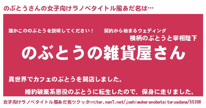 のぶとうさんの女子向けラノベタイトル風あだ名は… 『のぶとうの雑貨屋さん』『誰かこののぶとうを説明してください! ~契約から始まるウェディング~』『婚約破棄系悪役のぶとうに転生したので、保身に走りました。』 ツクッター #女子向けラノベタイトル風あだ名ツクッター http://tkutter.nan7.net/joshimukeranobetaitoruadana/55308/