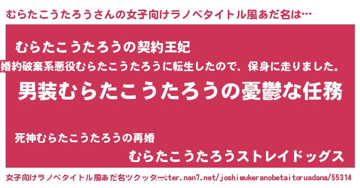 | 男性向けラノベタイトル風あだ名 | 『うちのむらたこうたろうが世界を掌握している!』 |