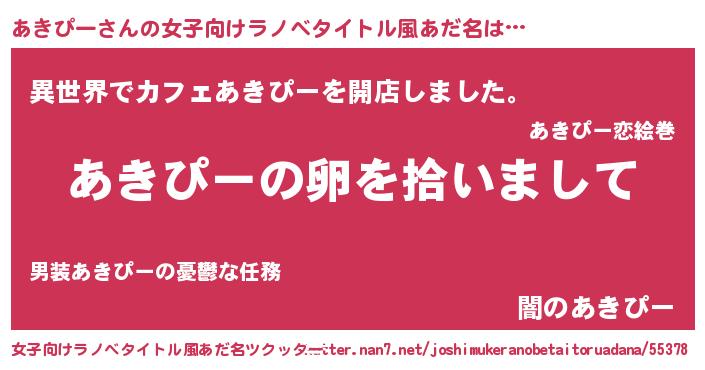 | 男性向けラノベタイトル風あだ名 | 『ダンジョンにあきぴーを求めるのは間違っているだろうか』 |