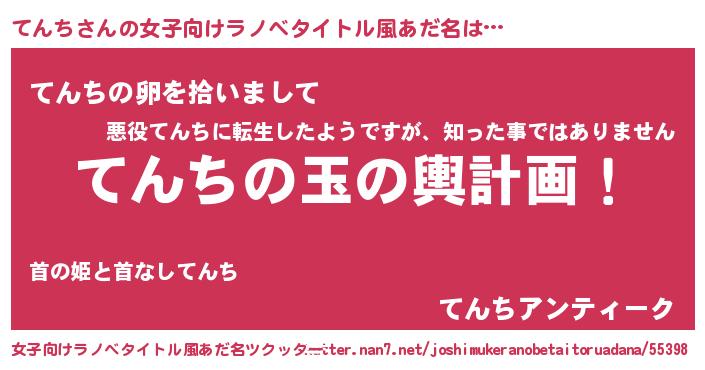 | 男性向けラノベタイトル風あだ名 | 『てんち~年齢イコール彼女いない歴の魔法使い~』 |